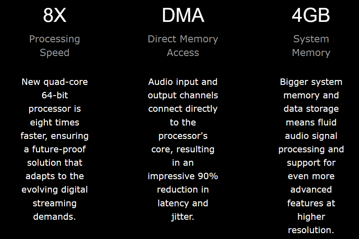 Built on a quad-core 64-bit architecture, our Tesla G3 streaming platform delivers eight times the processing capability of its predecessor. Equipped with 4GB of DDR4 system memory, the Tesla G3 can easily handle even the most demanding processing tasks, making it a future-proof solution which will accommodate the rapidly evolving digital audio landscape.