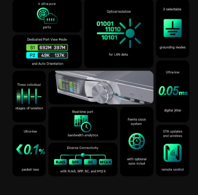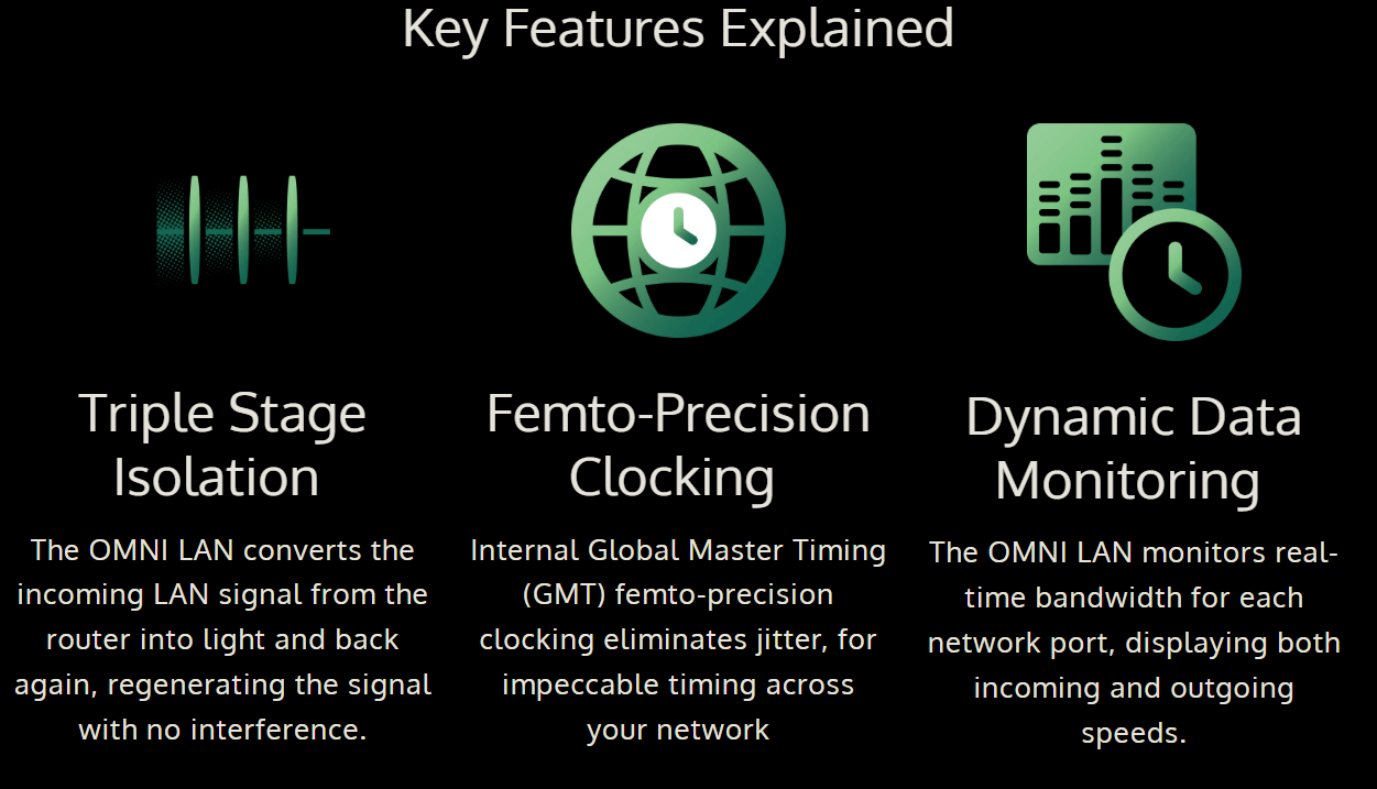 With triple-stage isolation – including optical galvanic isolation - femto-grade clocking, and pro-level configurability, the OMNI LAN is built to meet the demands of both audiophiles and professional environments.