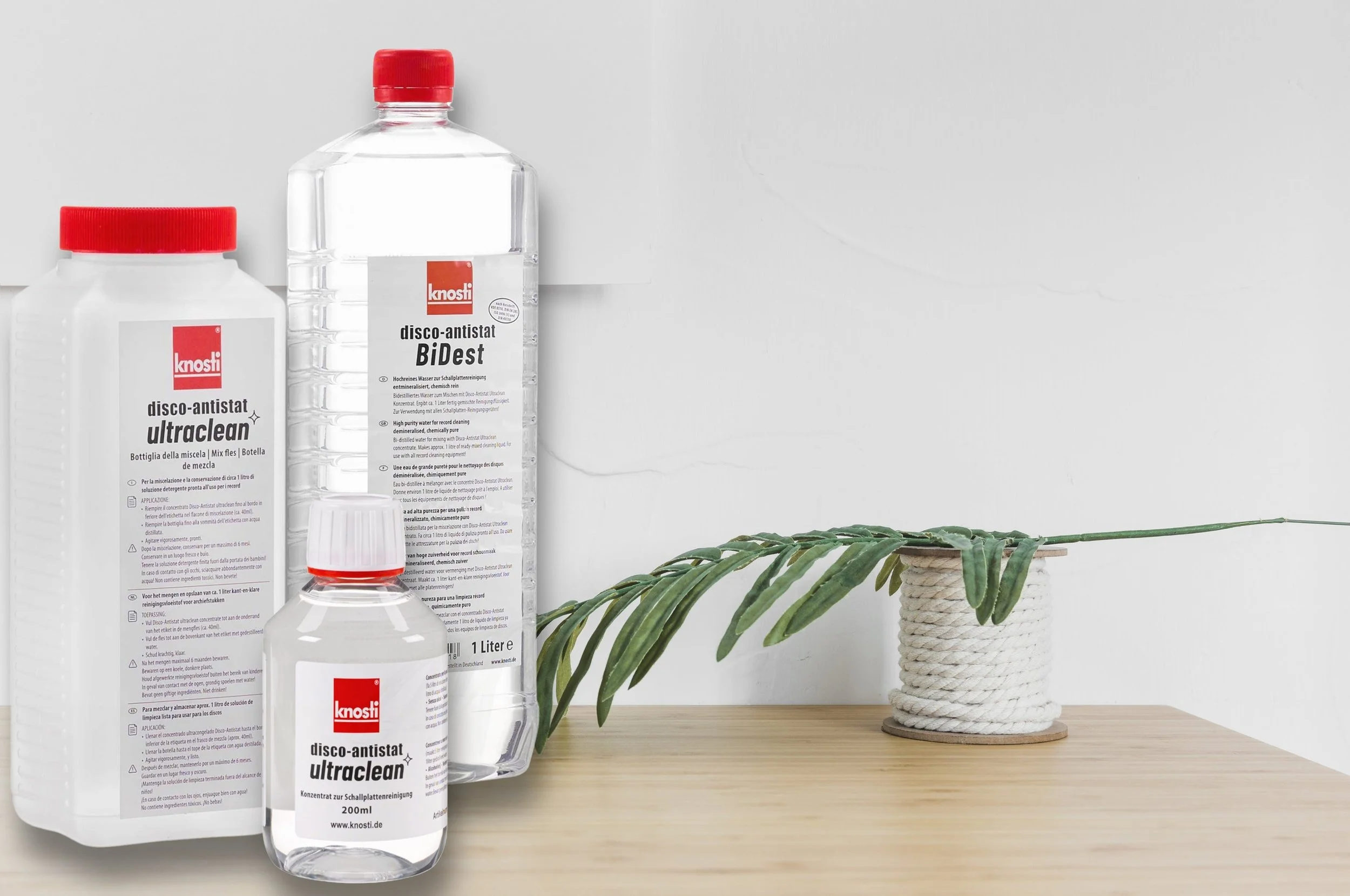 Disco-Antistat BiDest is a highly purified special water, such as that used in laboratories or cosmetics. All dissolved substances have been removed from the water using complex physical processes, making it pure H2O, unlike water available at hardware stores, for example. It is therefore ideal for all applications requiring the purest water. For optimal cleaning results with our Disco-Antistat Ultraclean Concentrate, we recommend using Disco-Antistat BiDest to prepare the cleaning fluid. Of course, Disco-Antistat BiDest is also suitable for a wide variety of other applications.