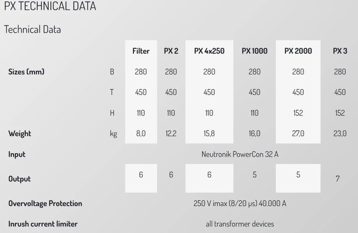 PX 3 offers a 2-stage current capability filter (16A), one 1000 VA transformer for amplifiers and two 250 VA transformers for source devices and preamplifiers.