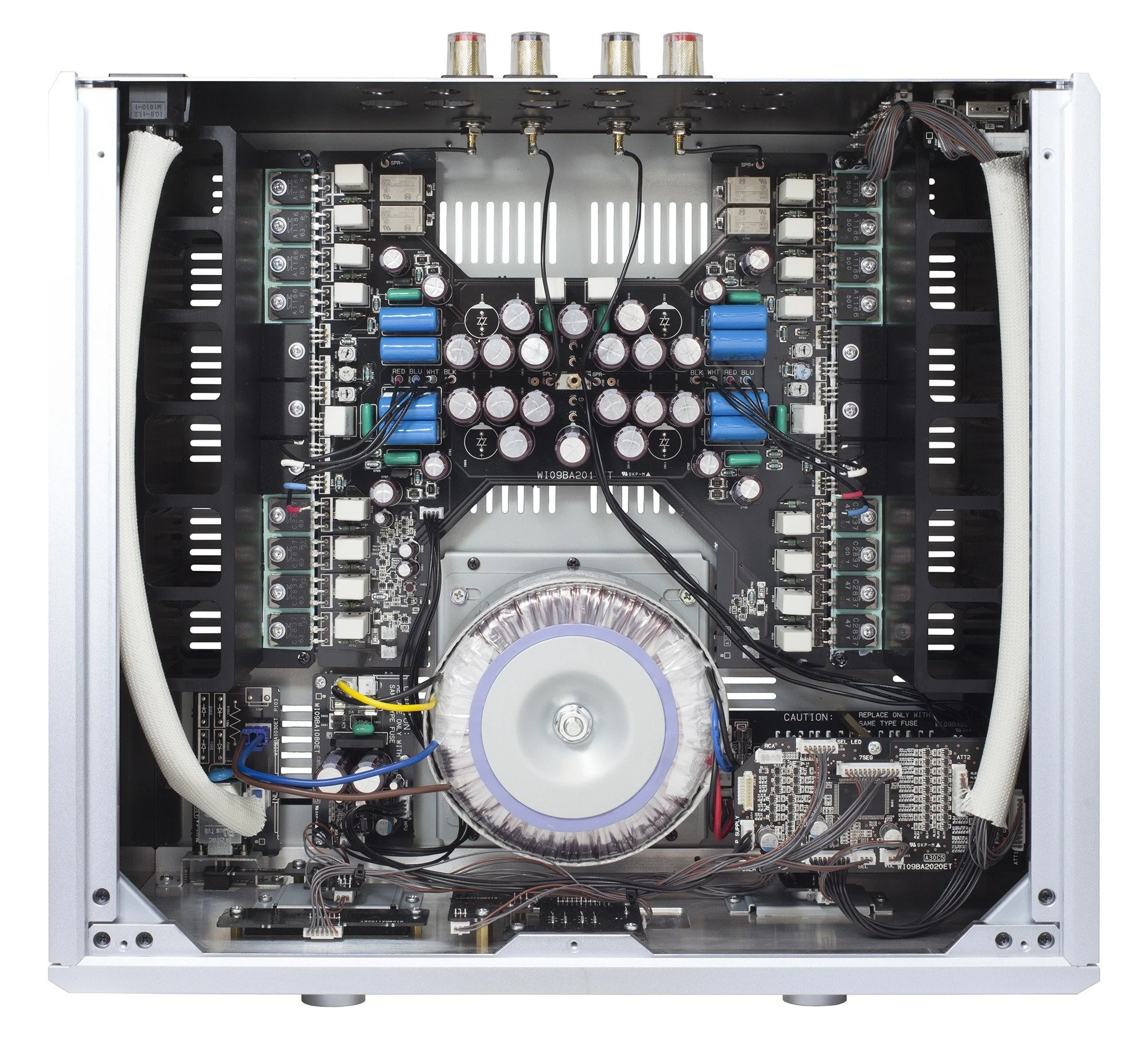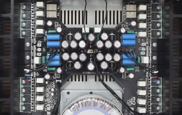 Composed of the output stage and the main power supply, the power block features an inner layer stratum of 70 micron thick copper foil as the power supply bus bar and thus minimizes high current loops in the commutating capacitor>>output transistor>>speakers + terminals>>speaker terminals>>commutating capacitor cycle. Eliminating inductance components in high current lines creates outstanding frequency characteristics and stability.