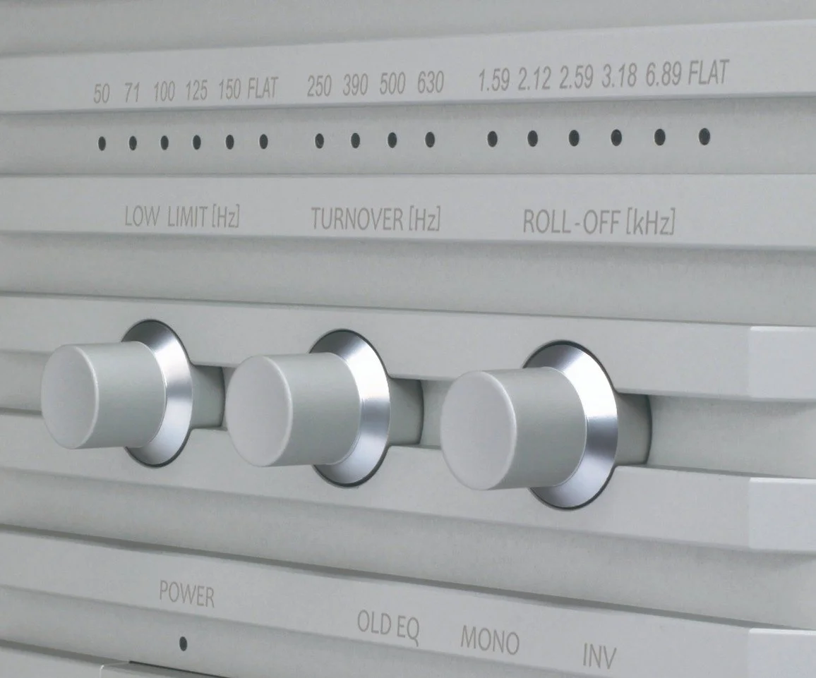 Together, they offer a total of 144 types of curves, from Decca and Columbia to the first SP records (with Flat response). By using these individual adjustment knobs, you can choose the most appropriate equalizer curve, or, alternatively, you can use the included equalizer curve sheet to customize the equalizer curve. Above all else, we use mechanical relays for switching the equalizer curve and prioritize sound quality.