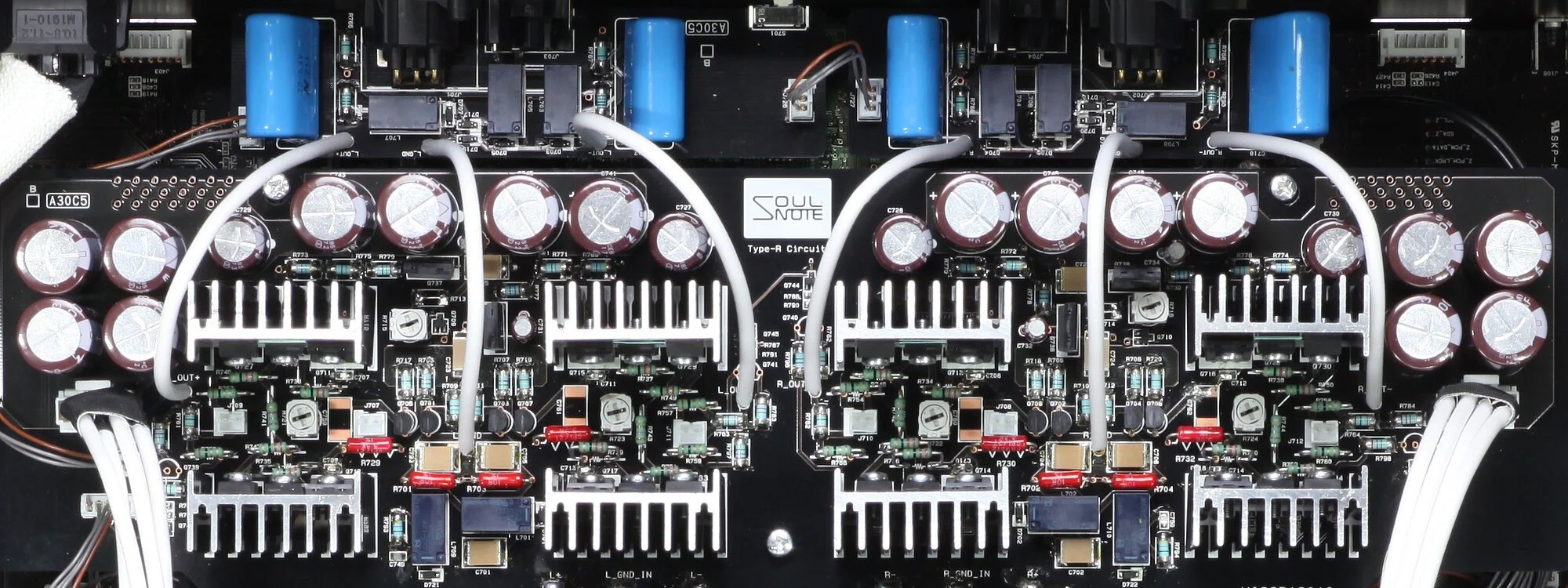 The analog circuits adopt the newly developed Type-R non-NFB circuits. These are balanced voltage amplifier circuits constructed using only 4 high-frequency bipolar junction transistors and 8 resistors. The first stage uses differential amplification without any gain. Gain is only generated in the second stage, which is a grounded single-end amp. And by changing the output stage bias from a LED solution to a transistor thermal coupling, the conventional emitter resistance of 22ohm has been successfully reduced to a mere 1ohm. This incredibly simple construction effectively eliminates power source noise to allow overwhelming drive power and enable the sound to truly shine with fresh and vivid expressiveness.
