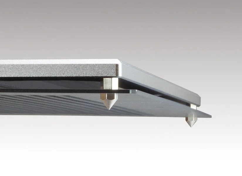 The SACD mechanism is mounted directly on a grounding spike through the machined aluminum base. This ideal construction emits vibrations from the mechanism directly to the grounding spike, while maintaining the physical location of the mechanism with a high degree of accuracy.