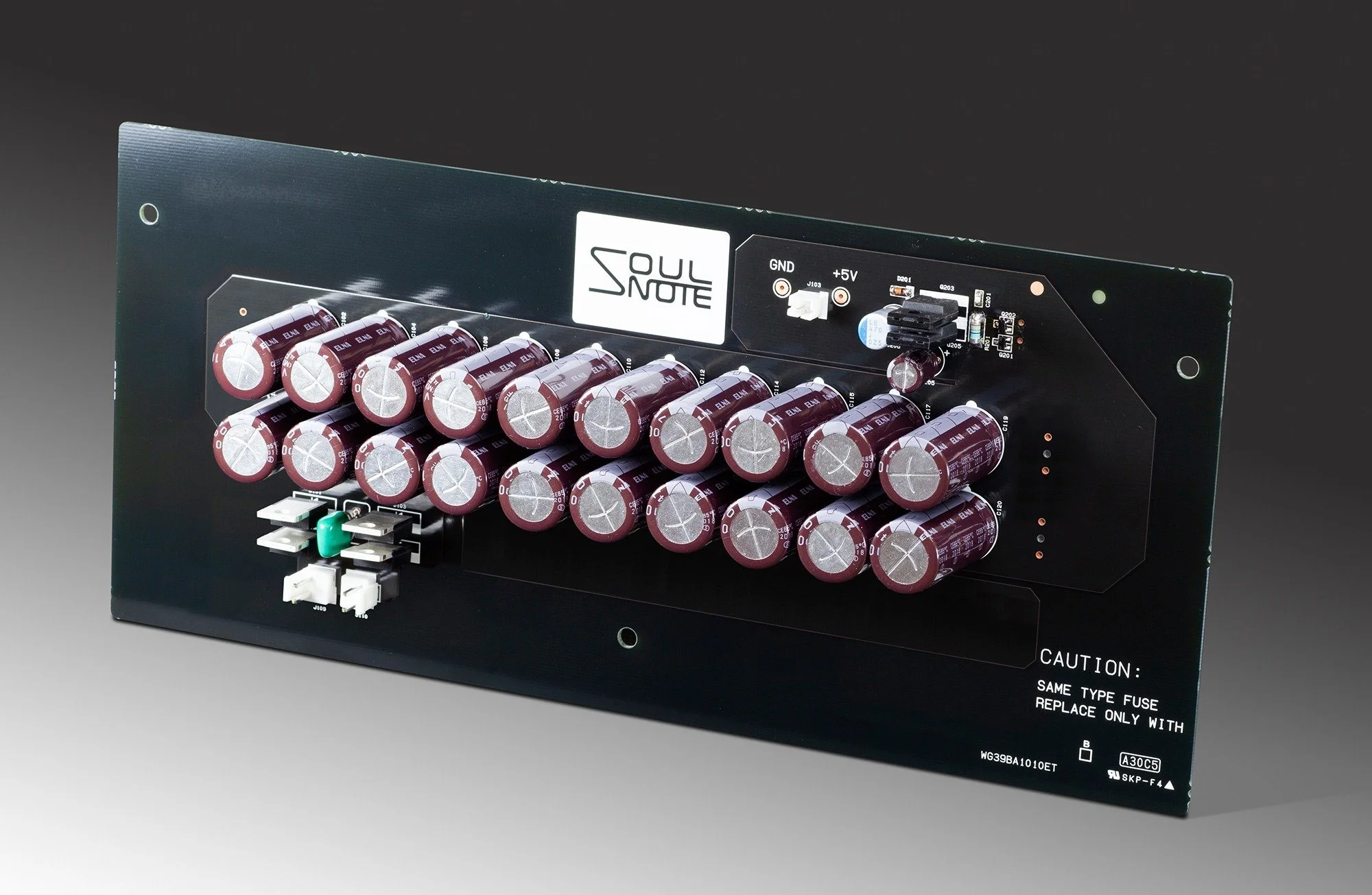 A high-capacity 200 VA toroidal transformer normally used in 100 W power amps provides an abundant power supply to drive the crystal oscillator. The rectifier diode relies on newly adopted ultra high-speed SiC diodes. The rectifier group is composed of numerous low-magnification, small-capacity electrolytic condensers connected in parallel, while the regulator incorporates SOULNOTE’s unique non-NFB discrete power supply.