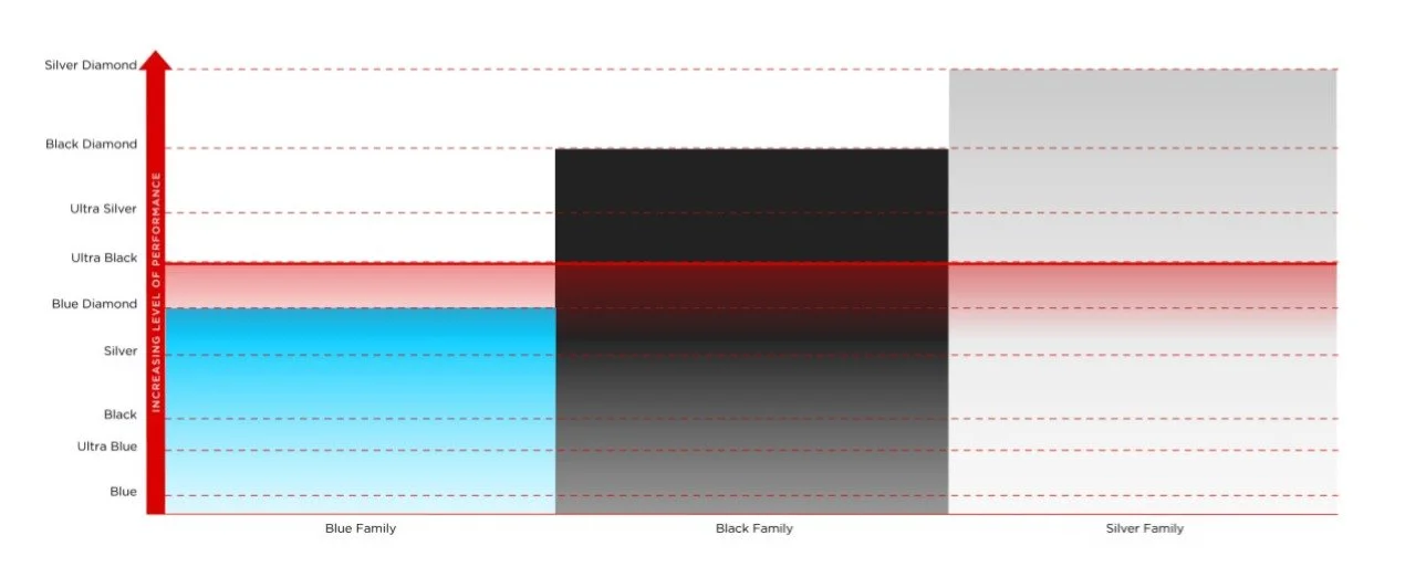 Blue Family: Warm and forgiving for systems with a slight edge or for those who like a more smooth laid back presentation. Blue and Ultra Blue are especially good for AV and home cinema